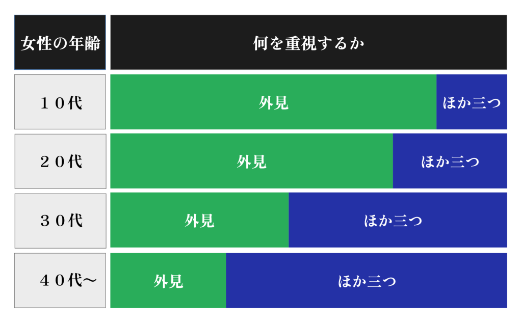 若い女性ほど外見を重視する傾向が強く、年齢を重ねるにつれ他の比重が重くなります。