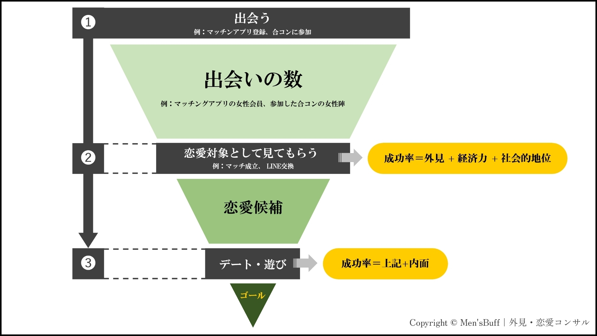 女性は「外見」「経済力」「社会的地位」などわかりやすい要素で恋愛対象としてありorなしを本能的に判断した後、デートやコミュニティーを通して「内面」の相性を確かめます。