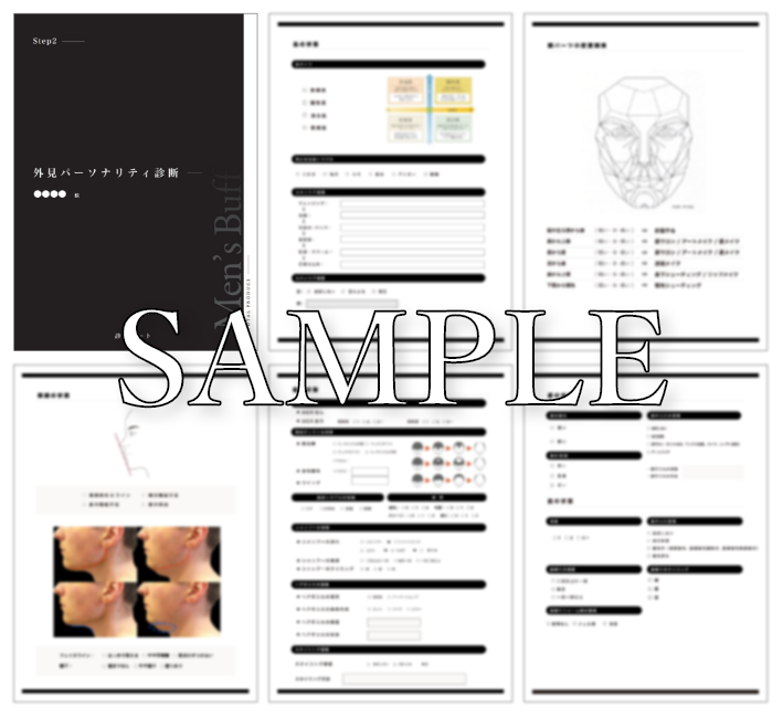 Men’sBuff外見コンサルでは、自社オリジナルの診断シートを使い、お顔の状態を徹底的に数値化して外見磨きのプランを作成しています。